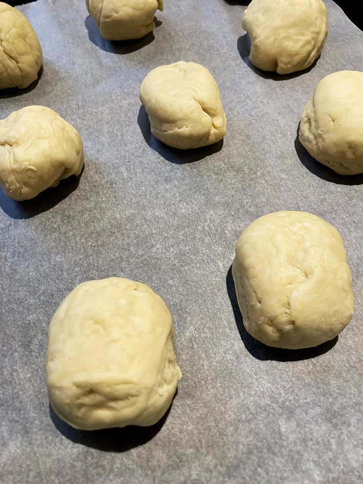 Den Teig in eine mit einem feuchten Küchentuch zugedeckten Schüssel legen. Ungefähr 1 bis 2 Stunden aufgehen lassen oder bis er die doppelte Grösse erreicht hat. Den Teig in zehn gleiche Stücke teilen. Die Stücke in runde Brötchen formen und auf ein mit Backpapier ausgelegtes Blech legen. Die Brötchen nochmals 30 Minuten aufgehen lassen.