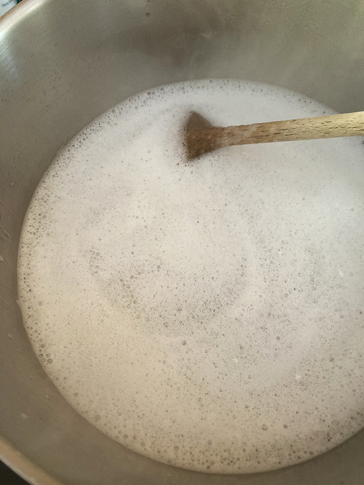 Während die Brötchen ruhen, das Backpulver (oder Natron) und Salz zu 1 Liter Wasser geben und alles aufkochen. Dann die Pfanne vom Herd nehmen.