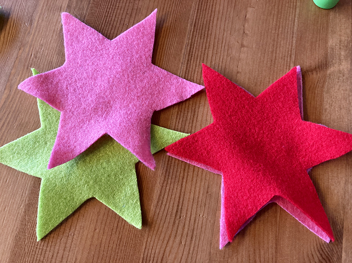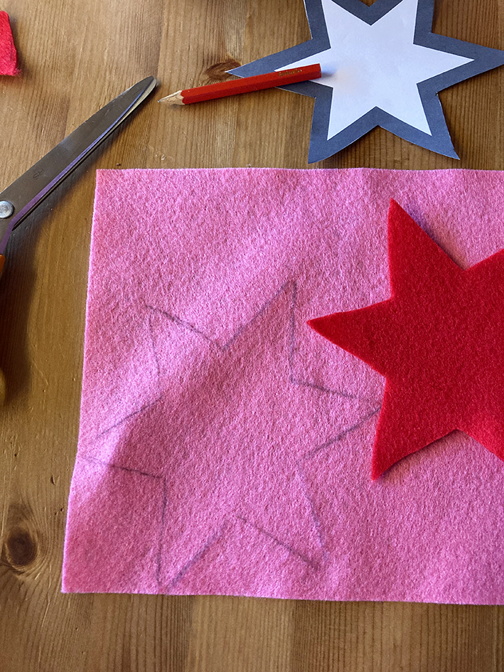 Die Stern-Vorlage auf den Filz legen und mit dem Bleistift nachfahren. Pro Zauberstab braucht ihr zwei Filzsterne.