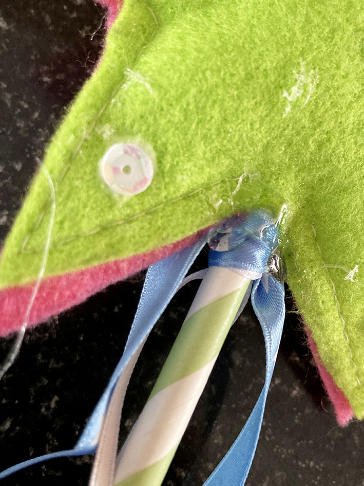 Den Strohhalm ganz oben, rundherum mit Heissleim einschmieren und sofort in die Öffnung stecken. Sie sollte nicht zu gross sein! So müsst ihr die Öffnung nicht zunähen, sie ist verschlossen und der Stab hält!