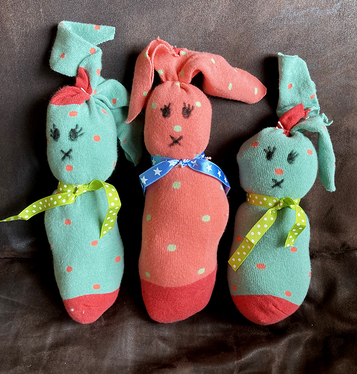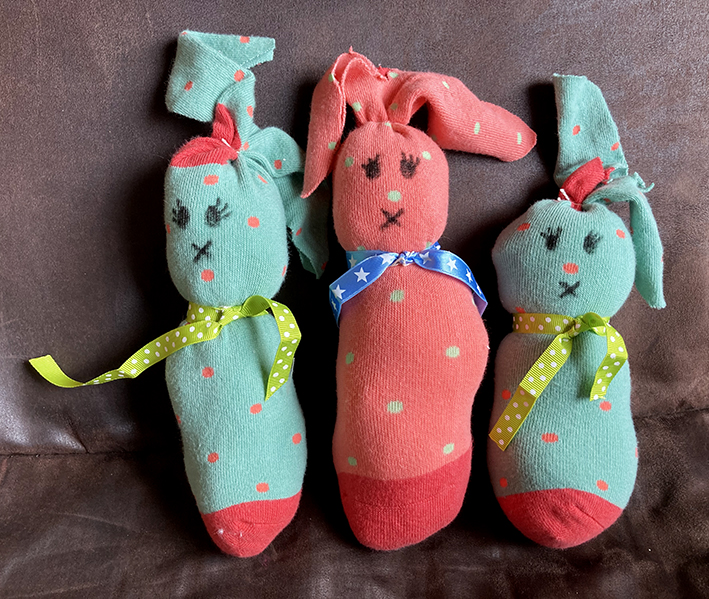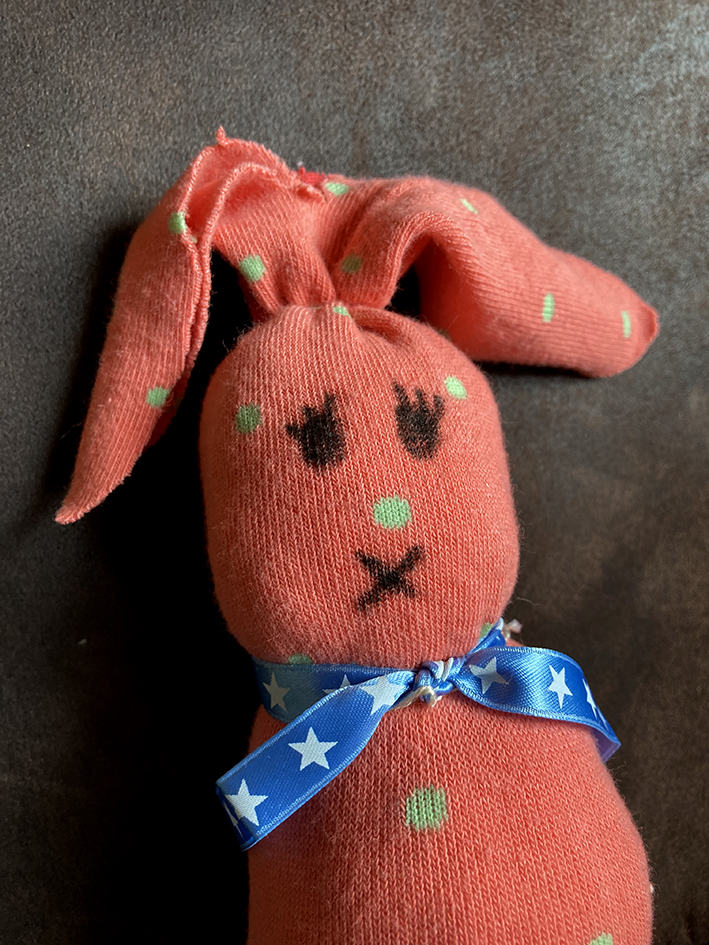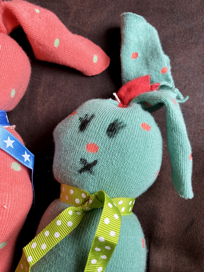 Mit einem schwarzen Stift Augen und Mund gemalt und einen hübschen Schal um den Hals gebunden. Fertig ist der Oster-Kuschelhase.