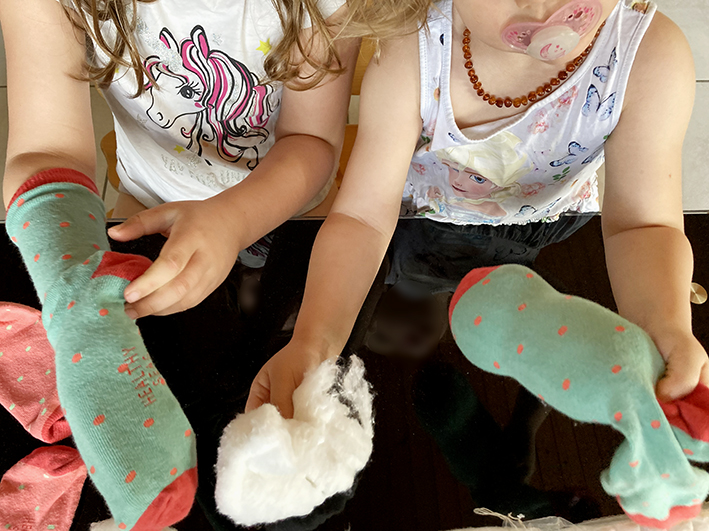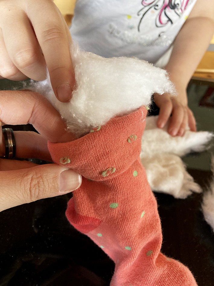 Den Socken mit Füllmaterial ziemlich satt vollstopfen bis er die gewünschte Grösse hat.