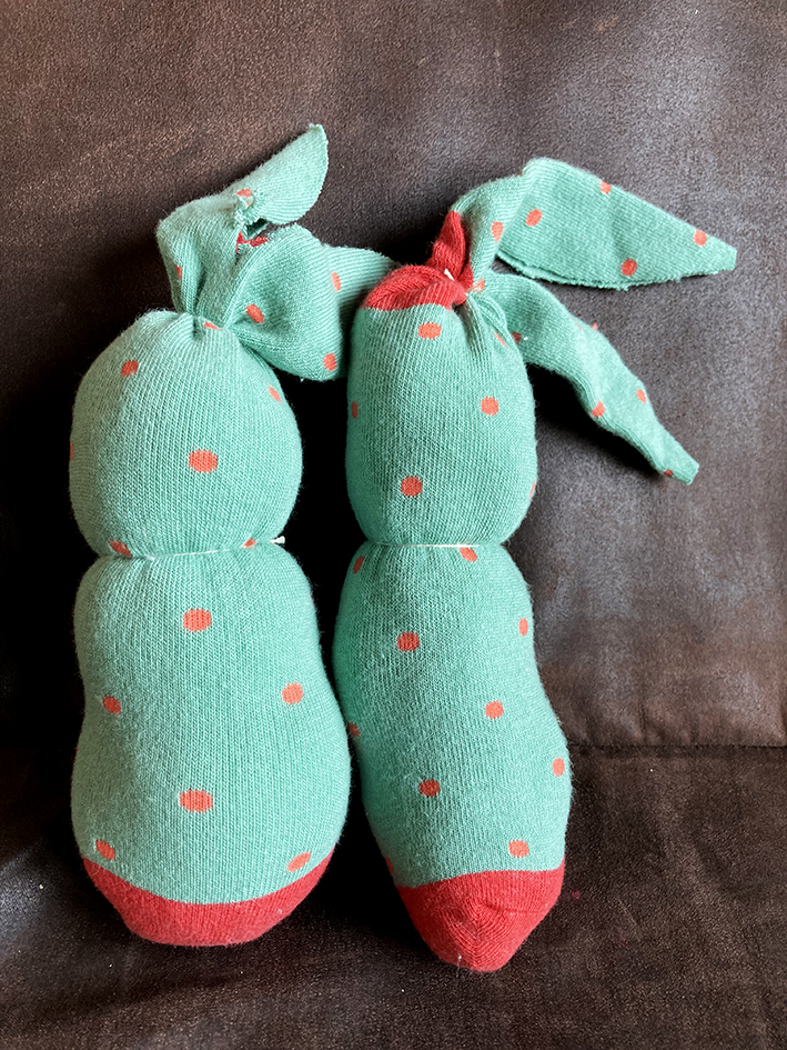 Mit Garn oben zusammenbinden. Den Rest des Socken mit der Schere abschneiden, dass die Ohren die gewünschte Länge haben.