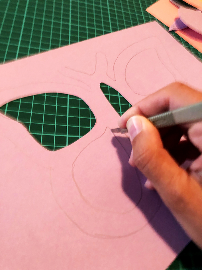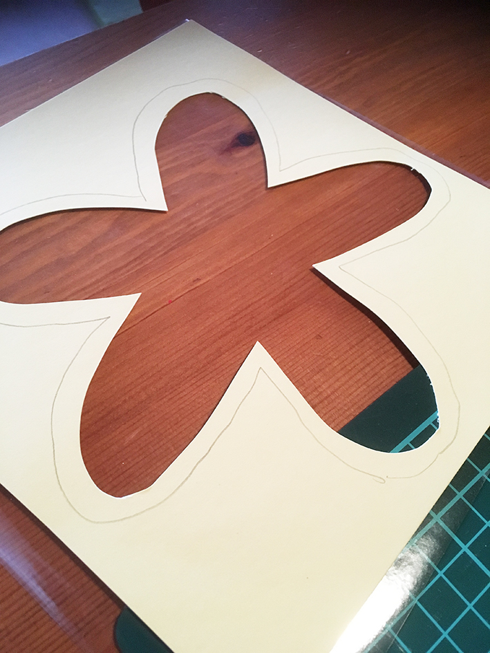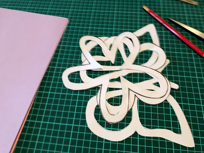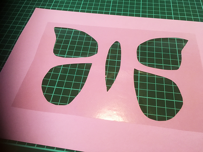 Als Vorlage habe ich mir Blumen und Schmetterlinge ausgedruckt und ausgeschnitten. Diese habe ich dann auf festen Papierkarton übertragen und mit dem Skalpell oder Japanmesser den Innenteil ausgeschnitten.