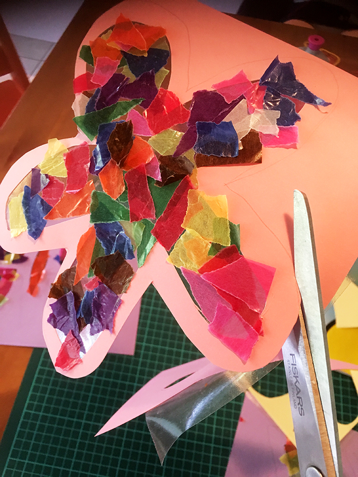 Das farbige Transparentpapier haben wir von Hand in verschieden grosse Schnipsel gerissen und nun nach Lust und Laune auf die klebende Seite der Folie geklebt.