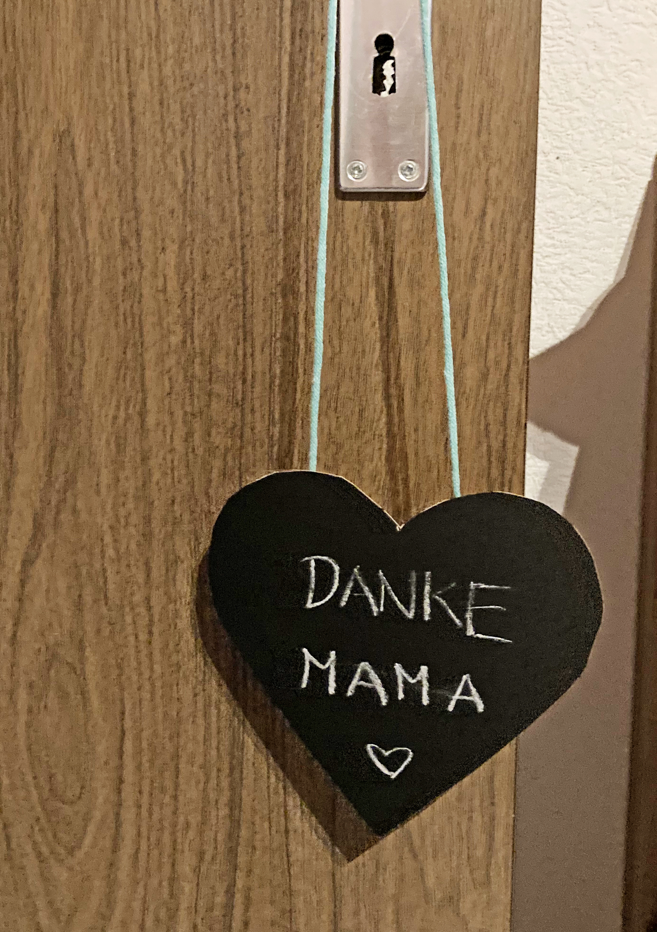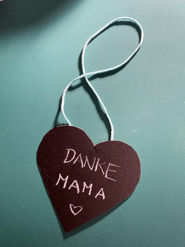 Die Tafelfolie auf den Karton kleben. Auf den Karton ein Herz malen und ausschneiden. Die Schnur in der gewünschten Länge mit einem Klebstreifen ankleben. Mit der Kreide eine liebe Botschaft schreiben – fertig ist das Geschenk!