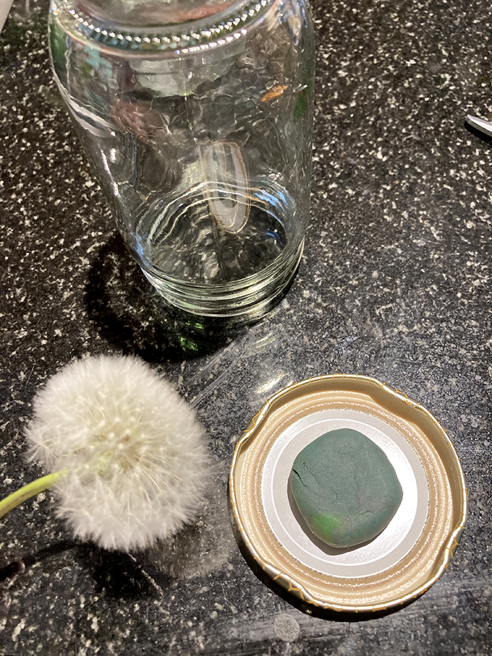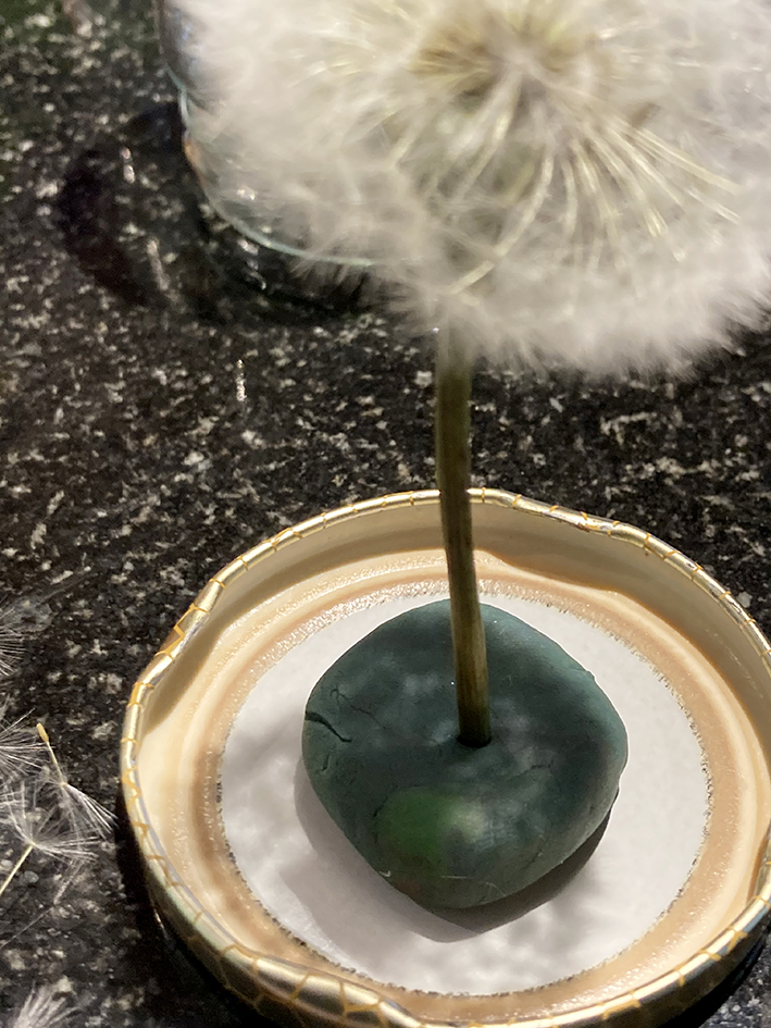Wenn die Pusteblume aufgegangen ist, testen ob die Schirmchen auch wirklich halten. Es gibt immer einige, die trotzdem wegfliegen… die gewünschte auswählen und in ein Stück Knete stecken.