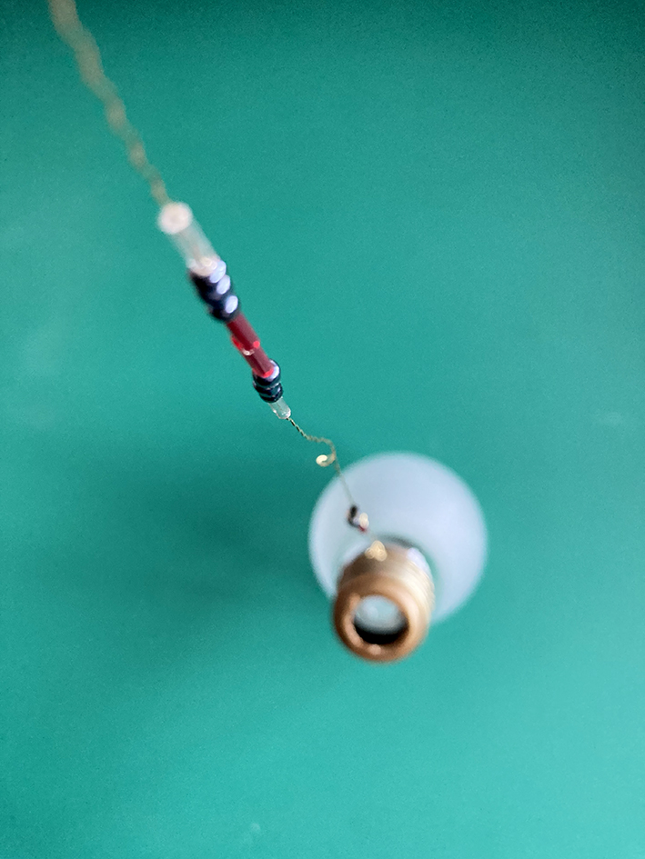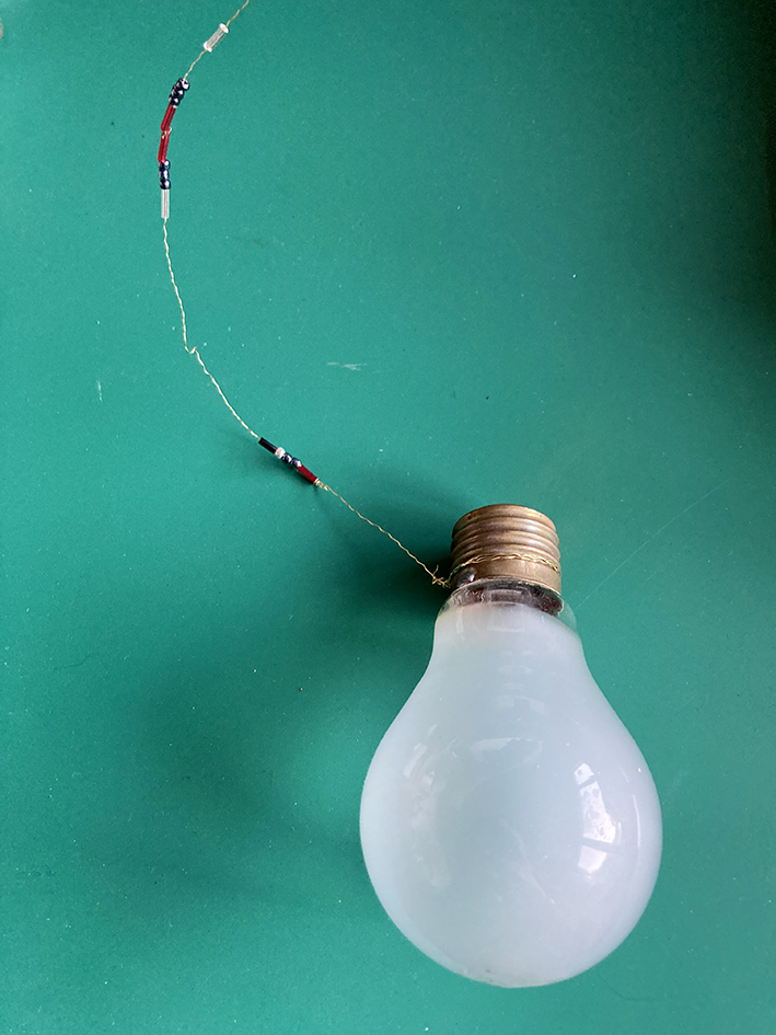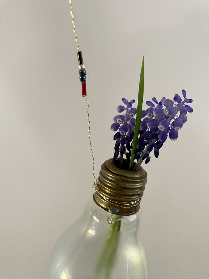 Wenn der Innenteil draussen ist, könnt ihr auf einem schönen, filigranen Draht Perlen auffädeln und das Ende des Drahtes um die Glühbirne wickeln, so dass sie gut hält.