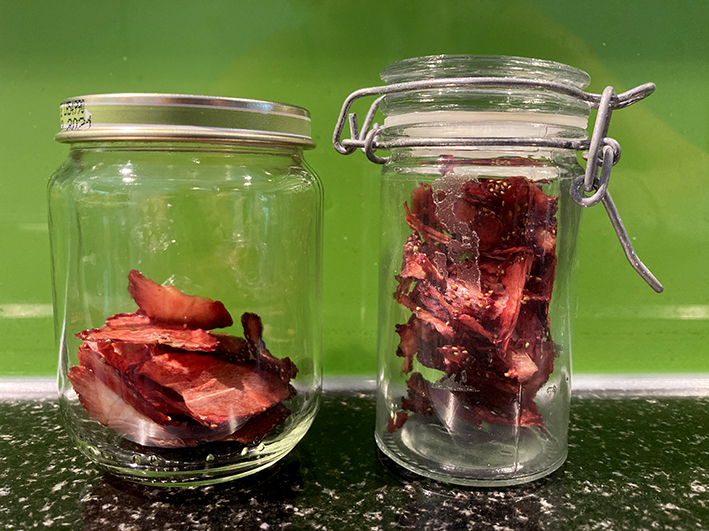 Einige habe ich in Scheiben geschnitten wie Chips um sie so zu essen oder als Dekoration für einen Kuchen, Muffin oder ein anderes Dessert.