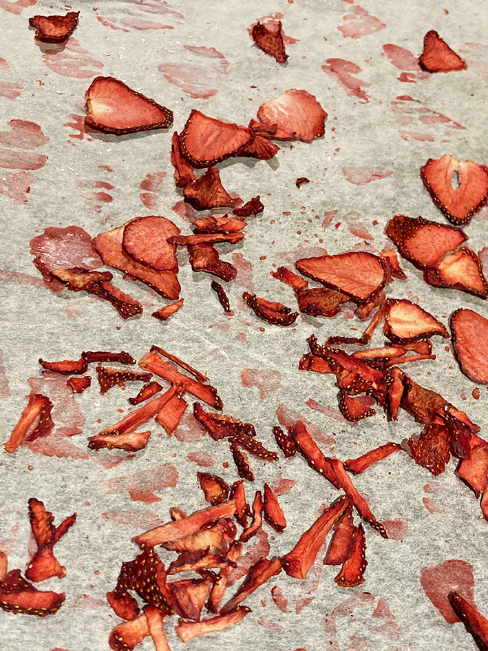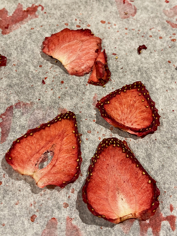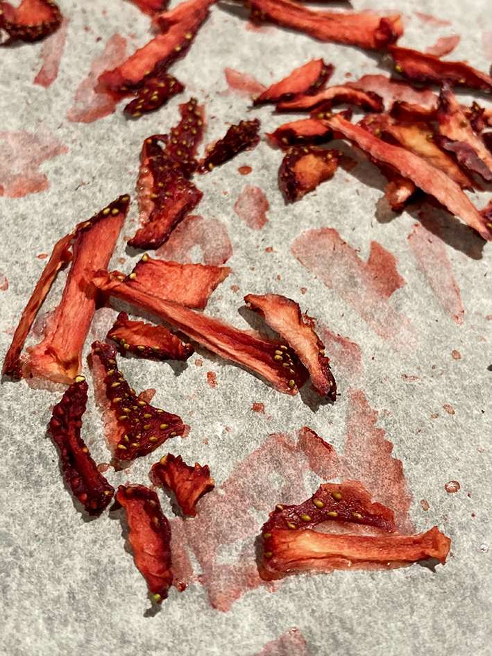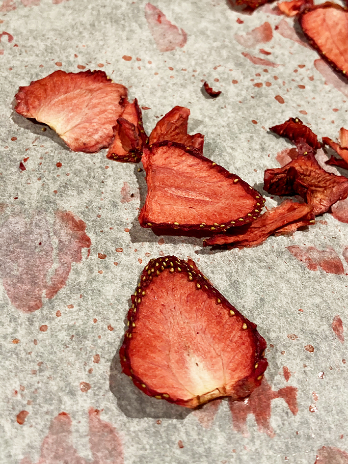 - Ofen auf 60° C Umluft vorheizen und die Erdbeeren auf einem mit Backpapier ausgelegten Blech, schön verteilt, für ca. 5-7 Stunden trocknen – variiert je nach dicke der Scheiben/Stücke – also kontrolliert ihr am Besten zwischendurch immer wieder