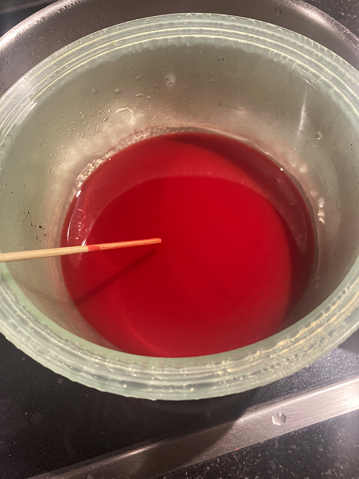 Alte Kerzenreste, z.B. von Weihnachten, im Wasserbad schmelzen. Wenn der Wachs flüssig ist, ein paar Tropfen Citronella Öl in den flüssigen Wachs giessen und gut umrühren.