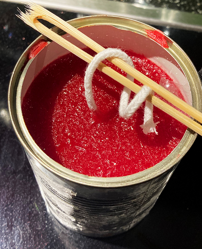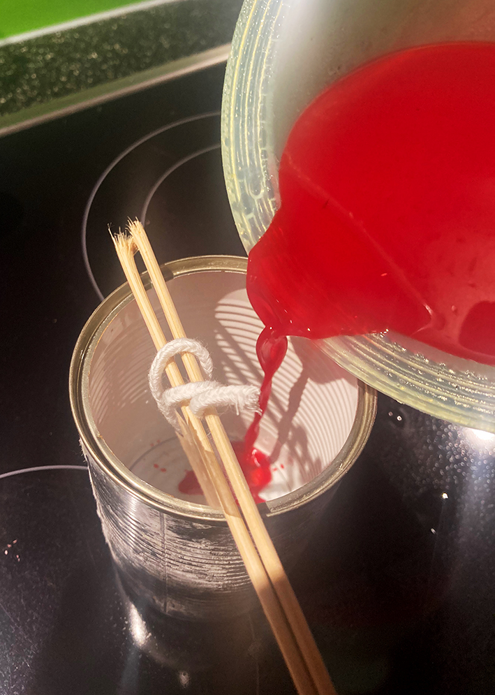 Einen Docht im Gefäss fixieren und den flüssigen Wachs ins Gefäss leeren.