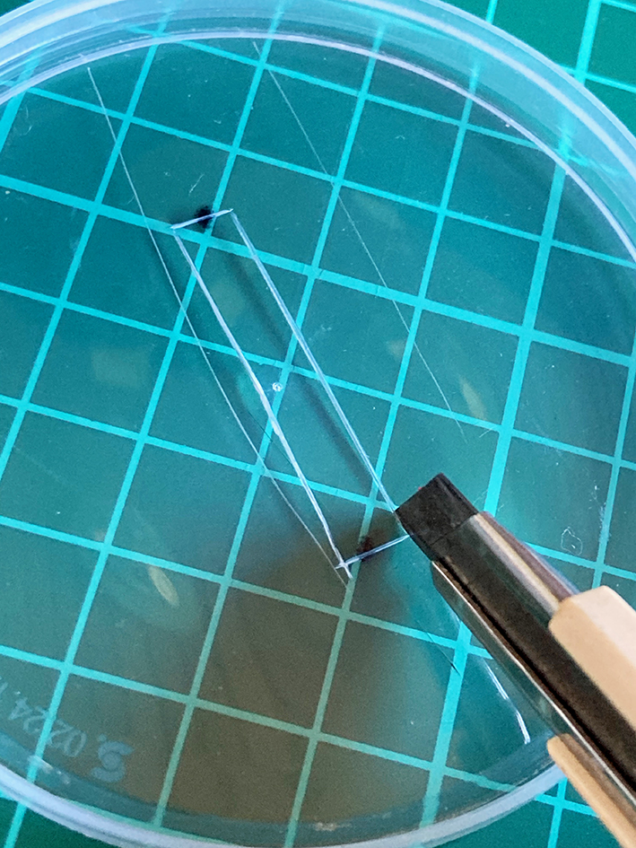 Mit dem Japanmesser aus der Plastikabdeckung einen Schlitz schneiden.