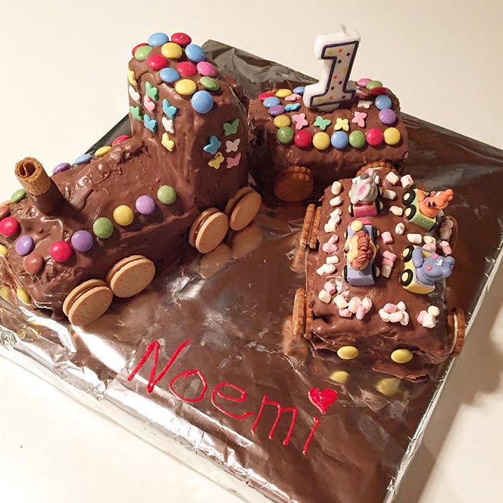 - Für die Lokomotive schneidest du den Cake eher 1/3 zu 2/3, dann den kleineren Teil aufstellen