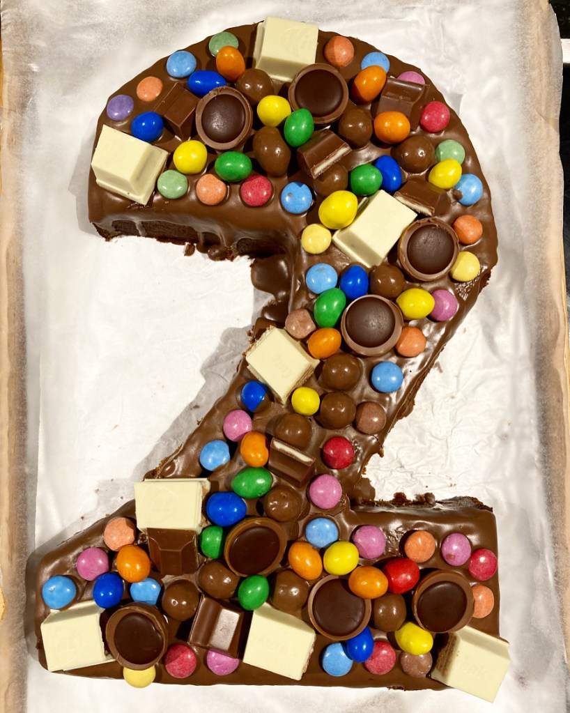 Ich habe eine Backform mit der ich sämtliche Buchstaben und Zahlen ungefähr nachbauen kann. Aber du kannst auch eine Vorlage mit der Zahl ausdrucken, auf einen Blechkuchen legen und der Vorlage entlang fahren. Oder schau mal im Netz nach, es gibt diverse Anleitungen wie man aus Keks-, Blech- und Springformen Zahlen nachbauen kann!