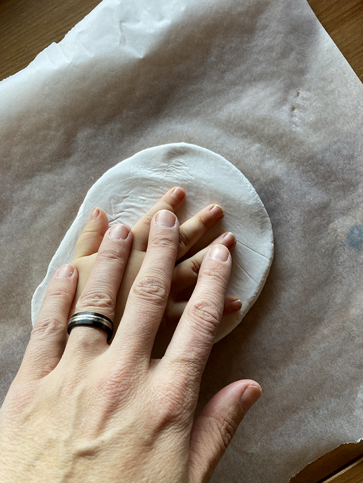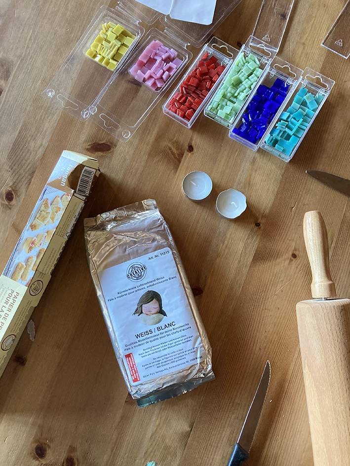 Die Modelliermasse zwischen zwei Bögen Backpapier ausrollen und in die gewünschte Form bringen.