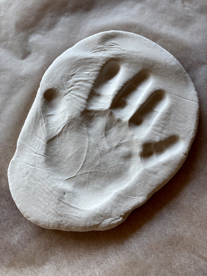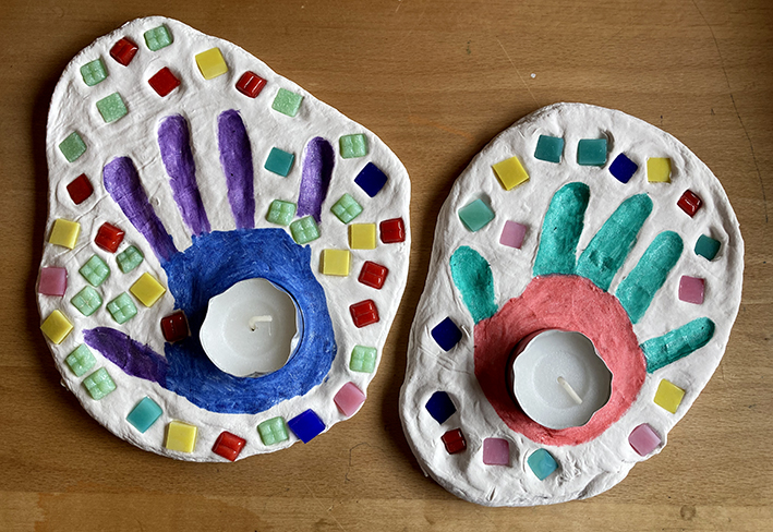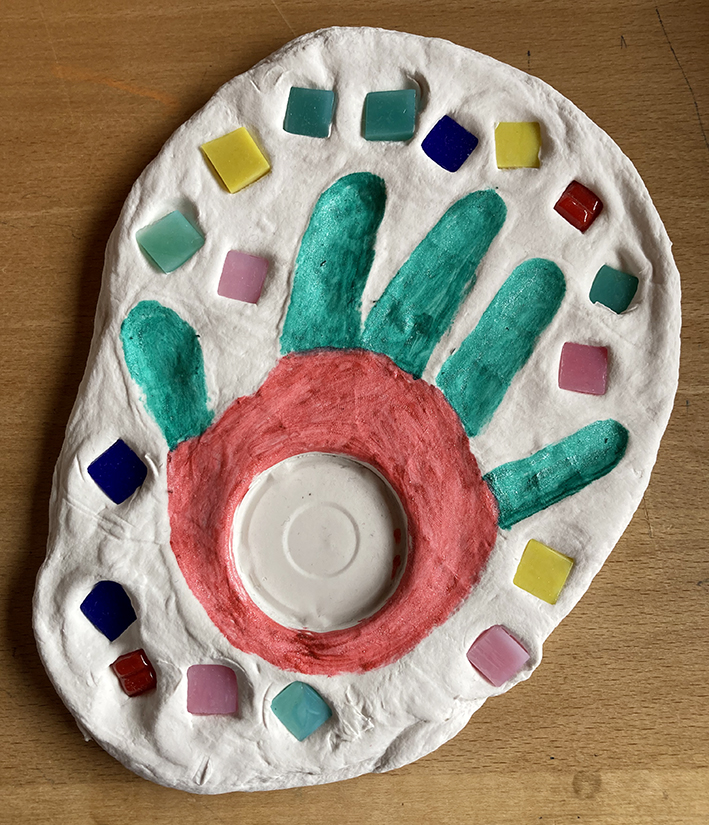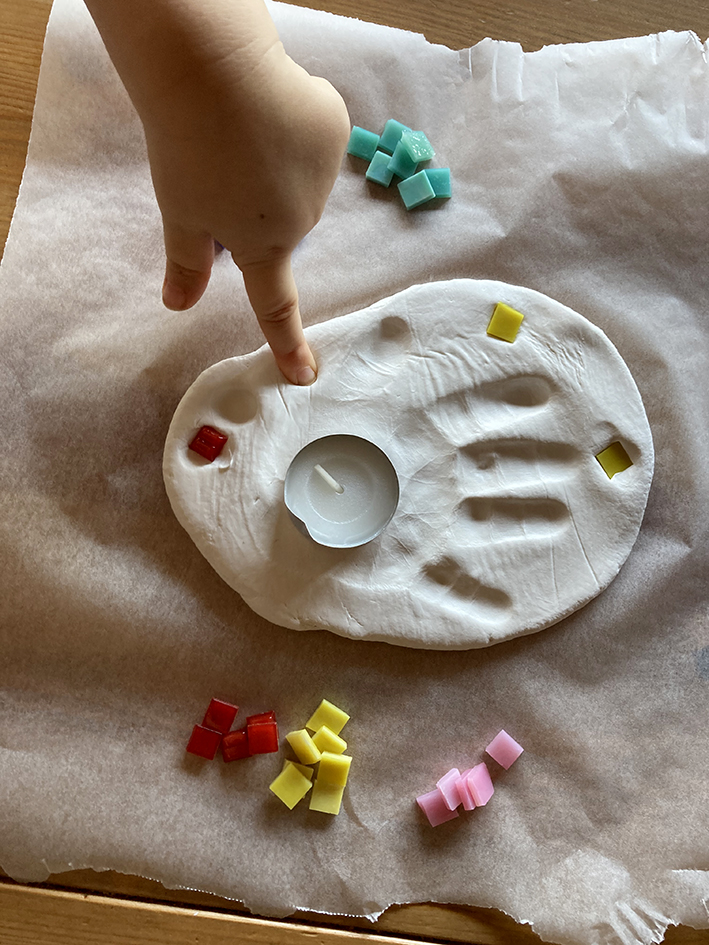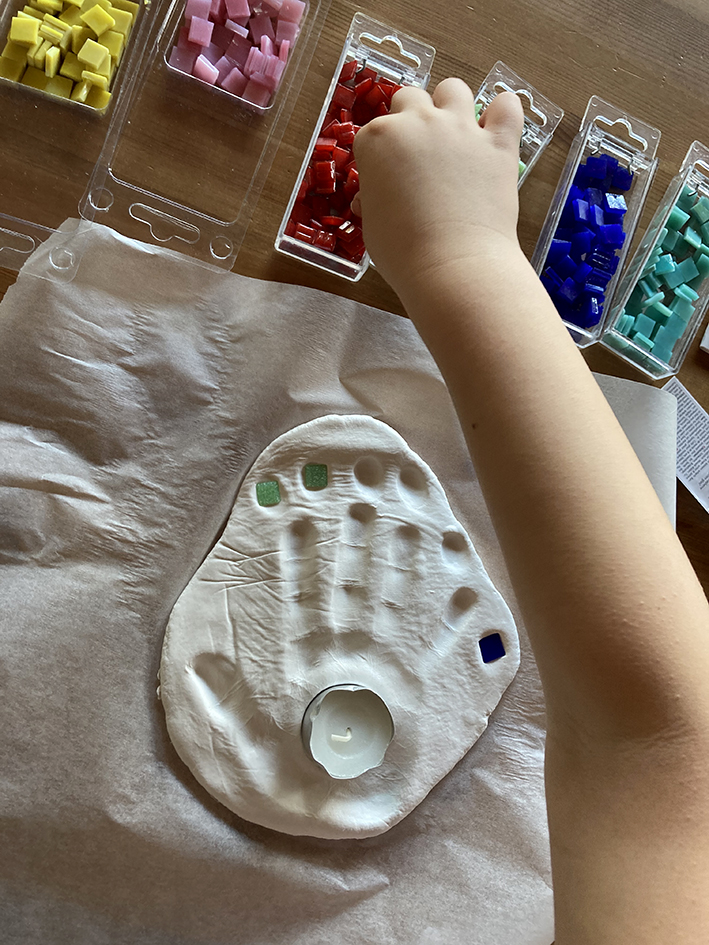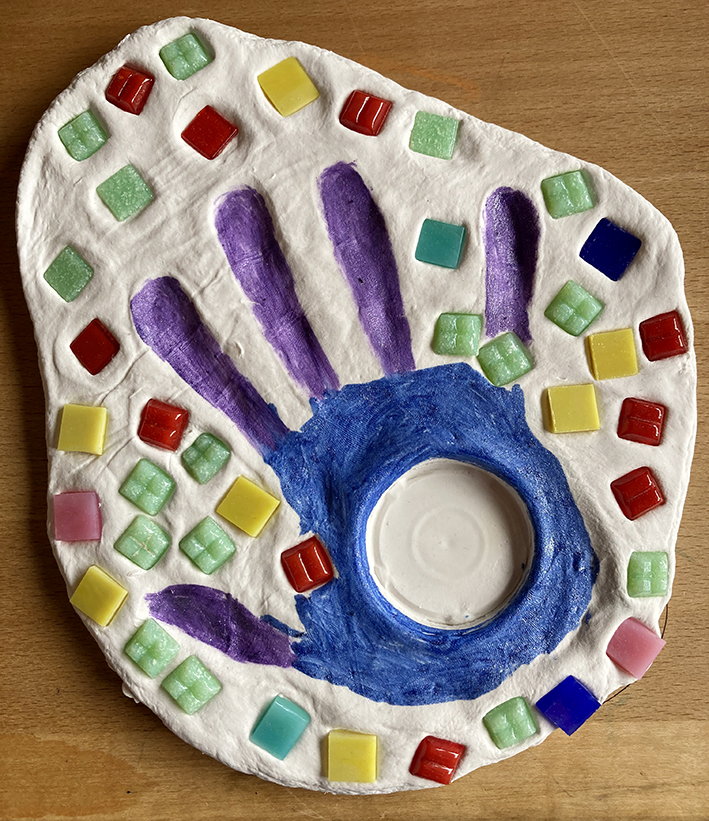 Die Mosaiksteine rund um den Handabdruck in die Modelliermasse drücken