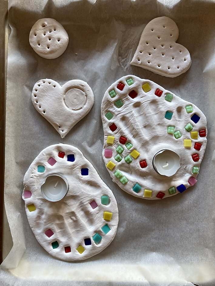 Wir haben aus der restlichen Modelliermasse Herzen ausgestochen und einen Kreis und mit einem Schaschlikspiess eingestochen, so können wir einzelne Blumen oder Gräser einstellen.