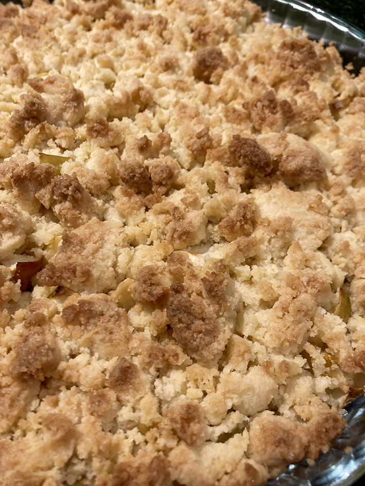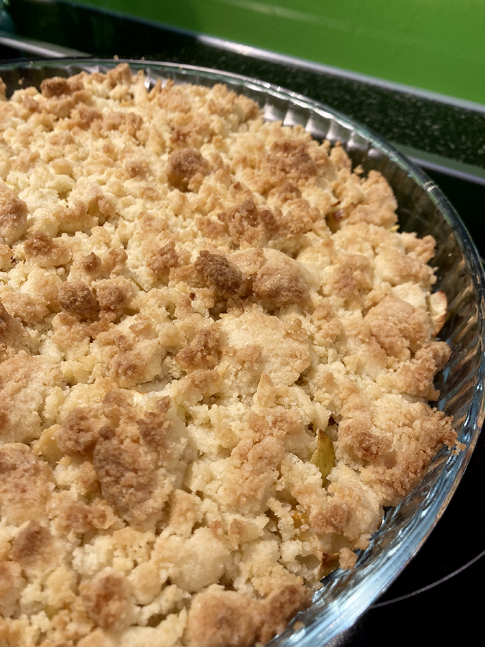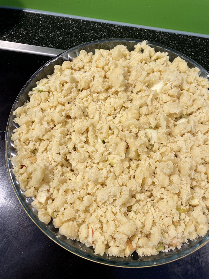 Die restlichen Zutaten für die Streusel vermischen und über die Äpfel zerbrosmen.