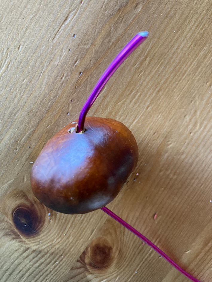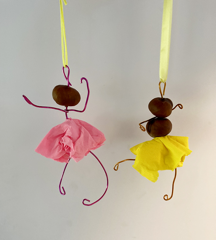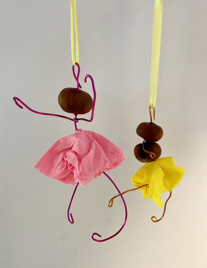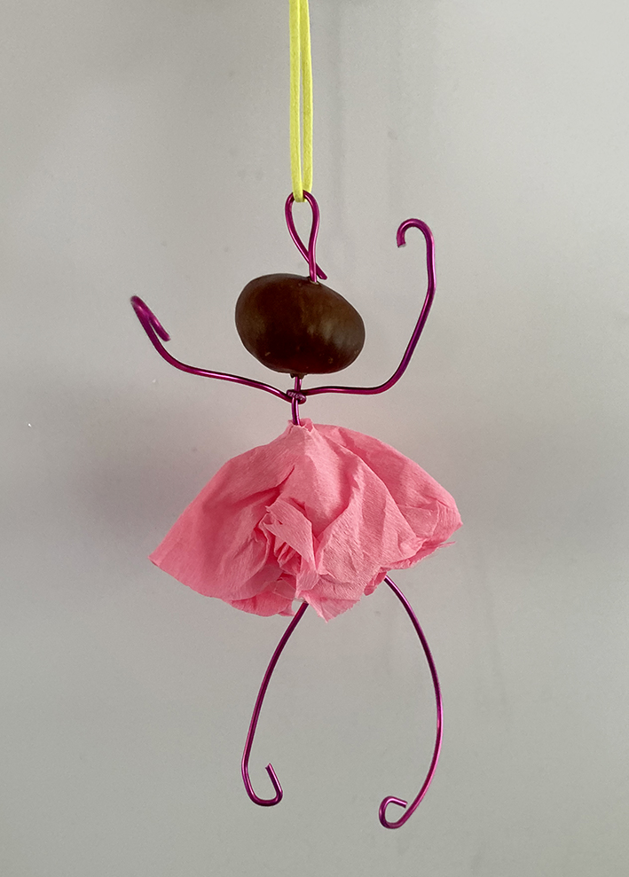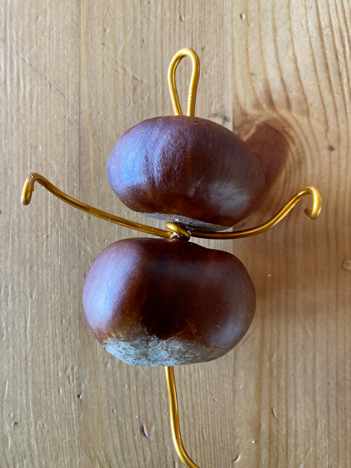 Die zweite Ballerina habe ich mit zwei Kastanien gemacht, als Bauch. Hier gehst du gleich vor, nur dass du eine weitere Kastanie auf den Draht fädelst.