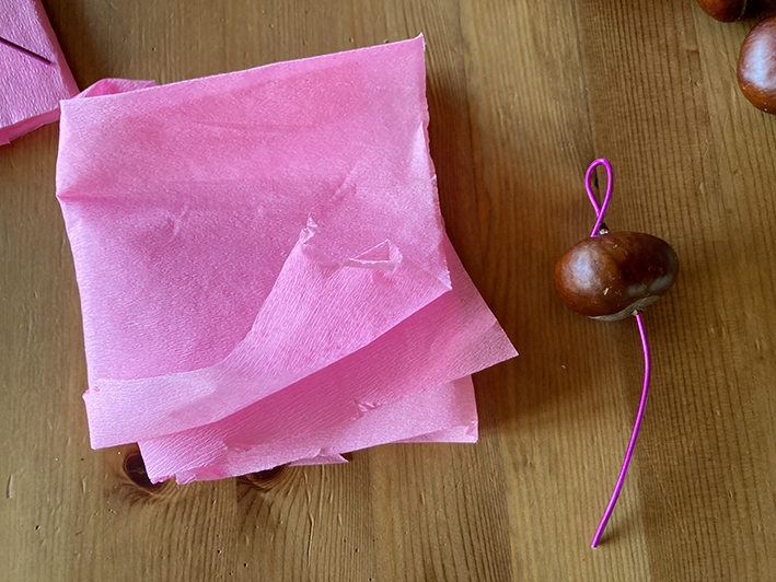 Unter der Kastanie mit der Zange einen weiteren Aludraht befestigen, so dass die Kastanie nicht mehr runterrutscht. Dies ergibt die Arme. Danach mit dem Aludraht das Krepppapier durchstechen und so «büschelen» dass es wie ein Röckli aussieht.