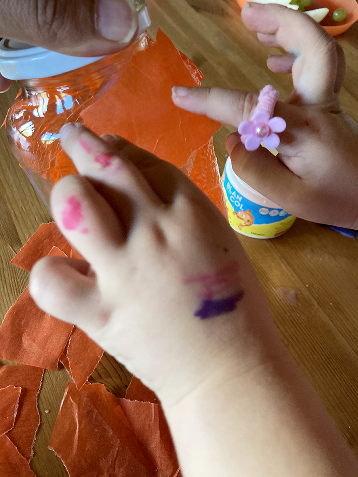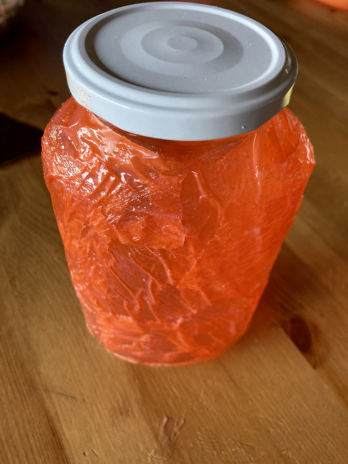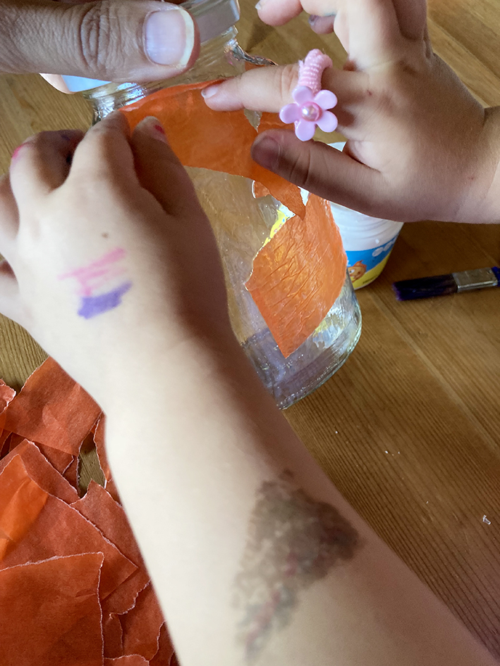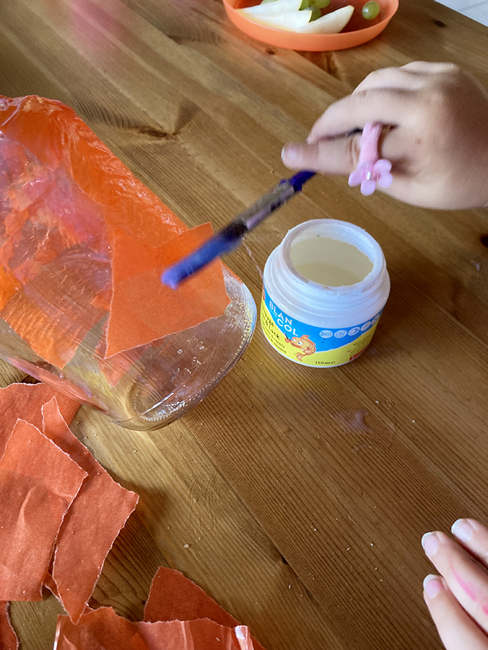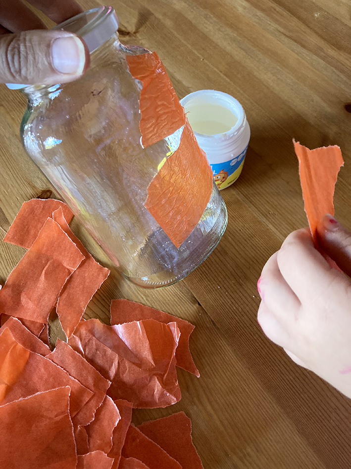 Das Transparentpapier in kleine Stücke reissen und mit dem Kleber rundherum kreuz und quer ans Glas kleben, sodass alle Stellen bedeckt sind.