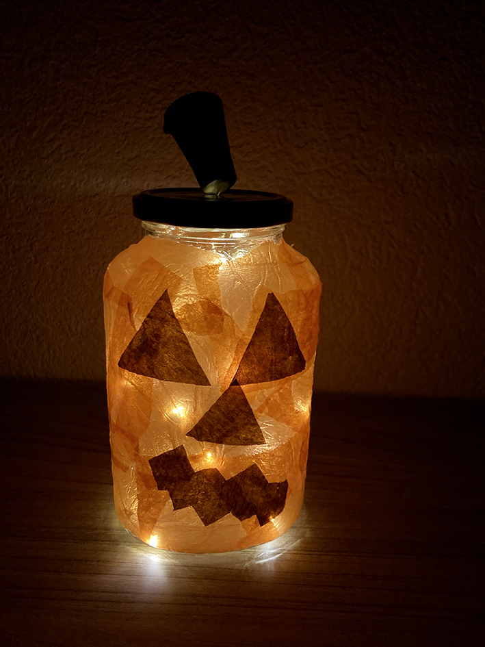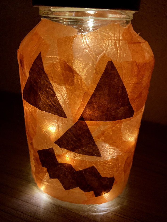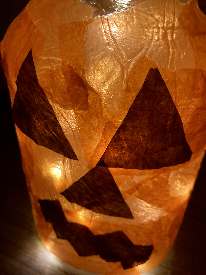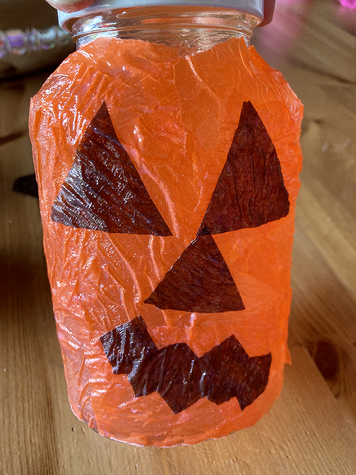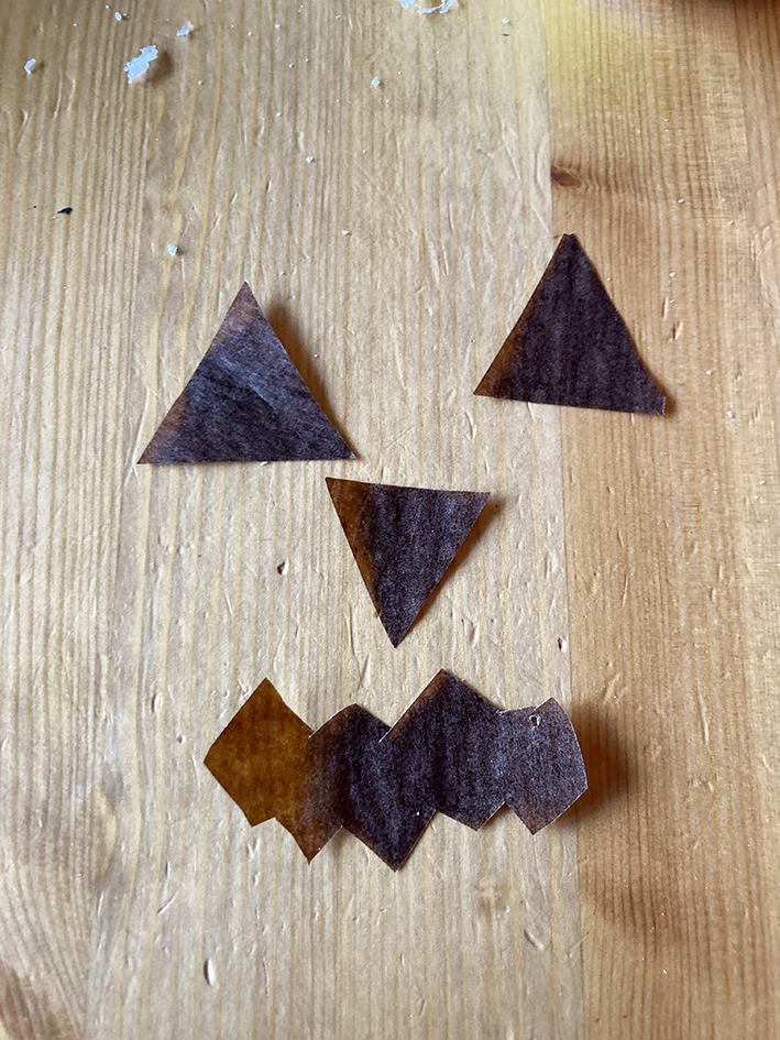 Wenn das Glas mit orangem Papier ummantelt ist, aus dem braunen Transparentpapier ein Kürbisgesicht ausschneiden.