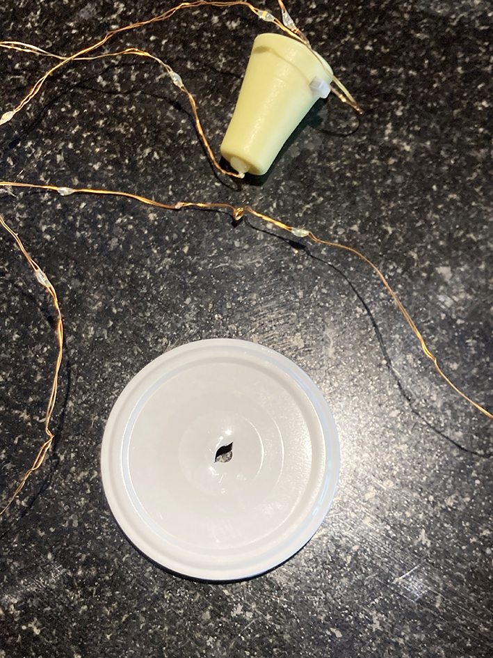 Mit der Schere ein Loch durch den Deckel stechen, so gross, dass die Lichterkette hindurch passt.