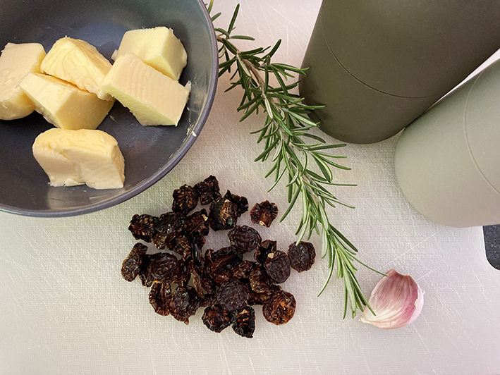 Wie du vielleicht schon mitbekommen hast, lieben wir verschiedene Brotaufstriche. Besonders beliebt: Butter mit allerlei Zutaten vermischt. Mein aktueller Liebling: Die Tomaten-Rosmarin-Butter