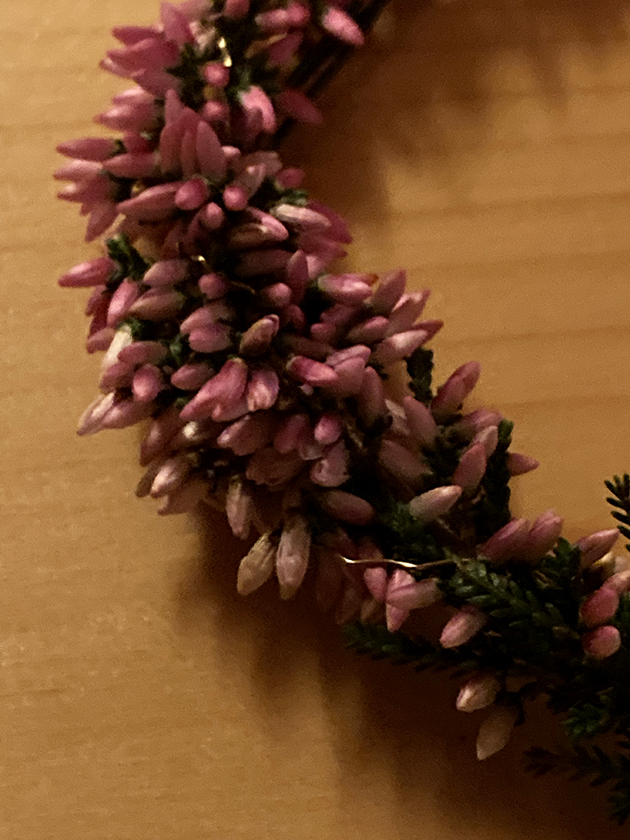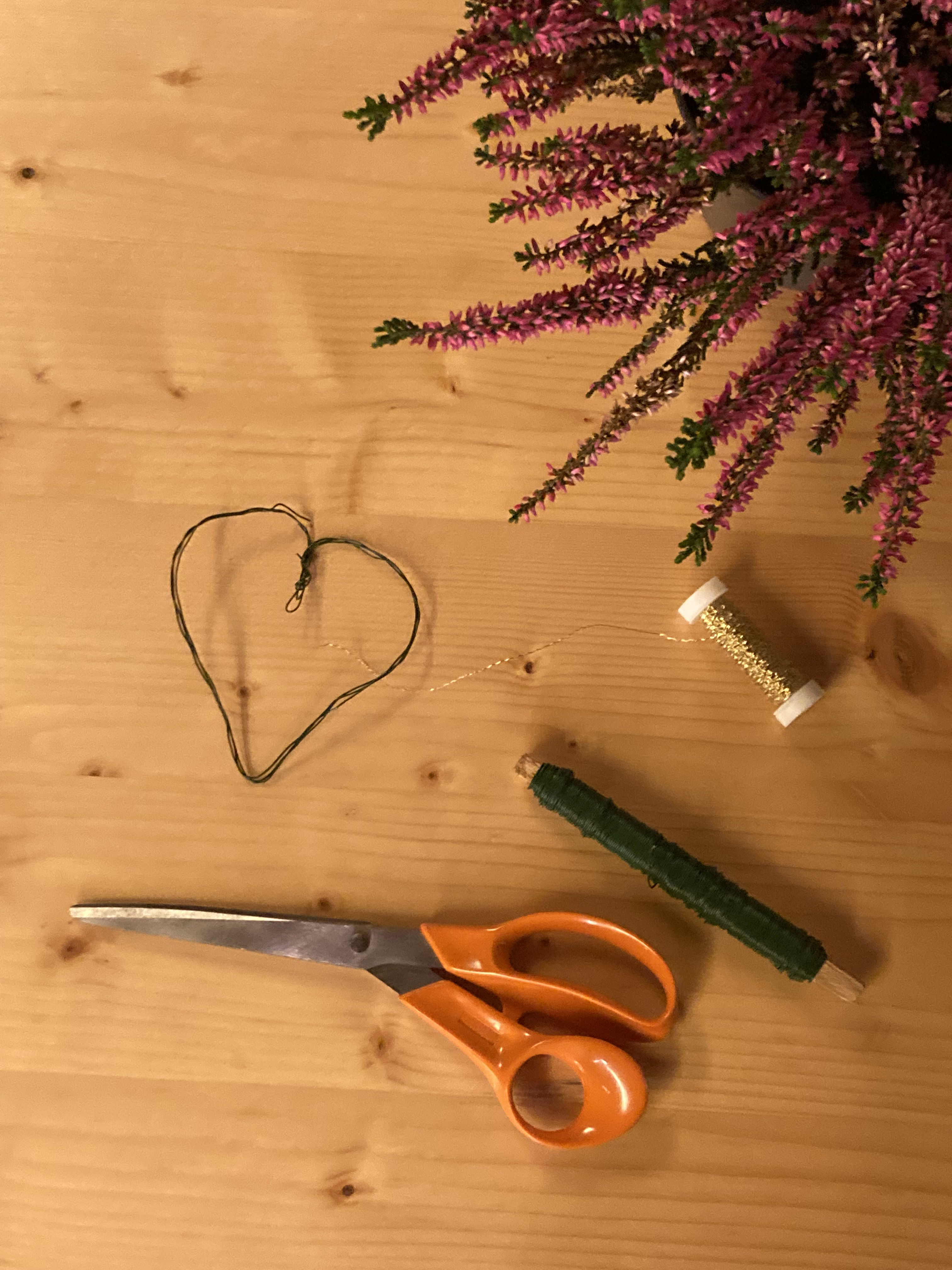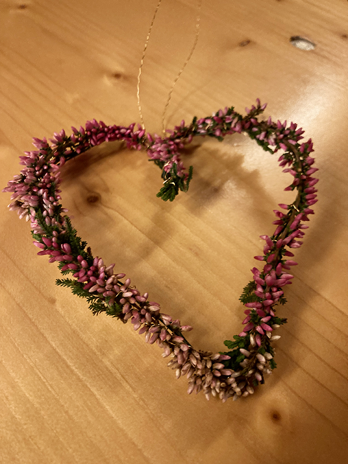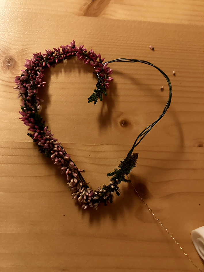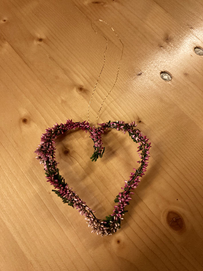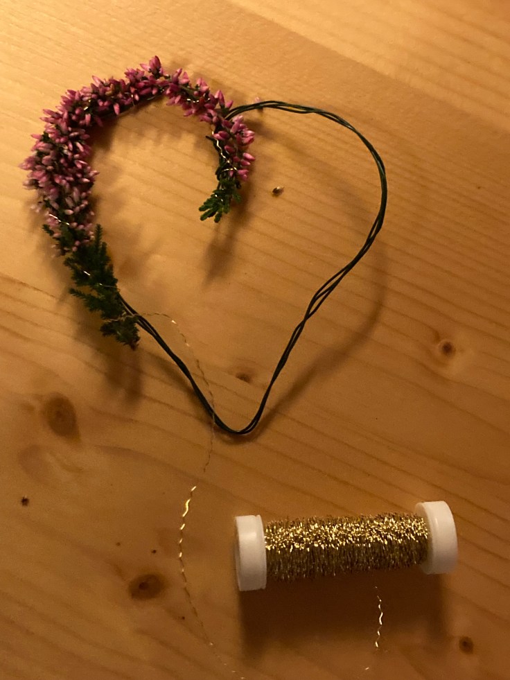 Jetzt kannst du einzelne Zweige des Heidekrauts abschneiden und mit dem Dekodraht an das Herz wickeln, bis das ganze Herz mit Heidekraut umwickelt ist.