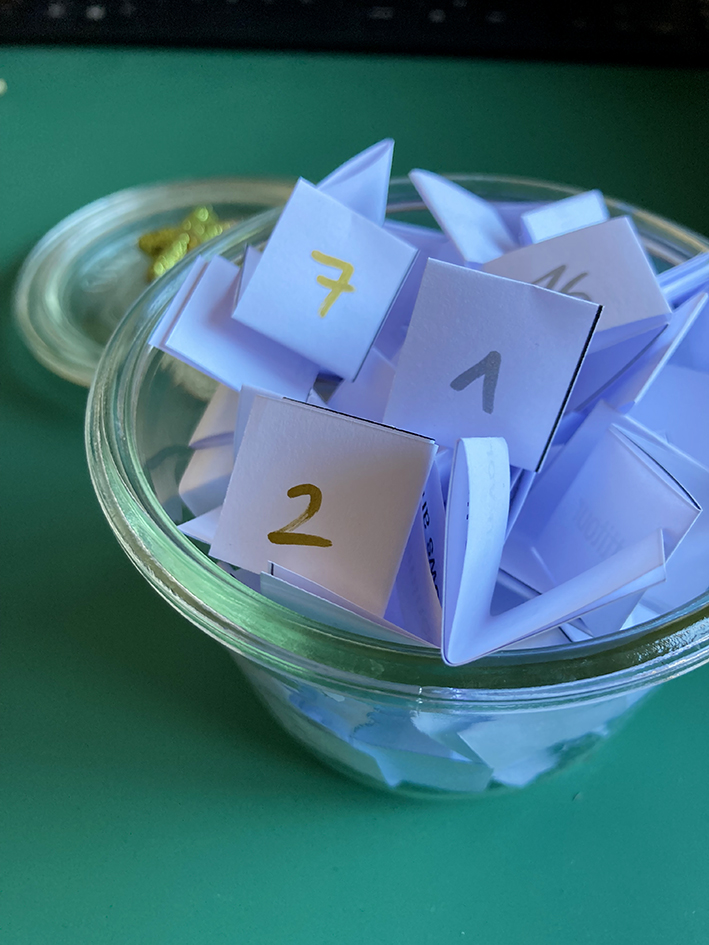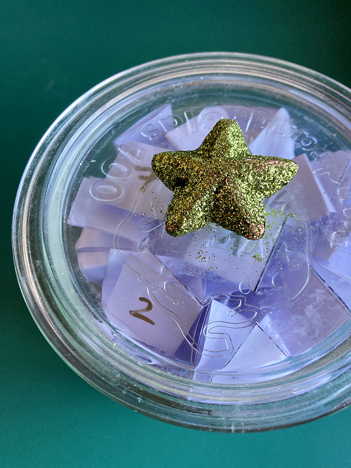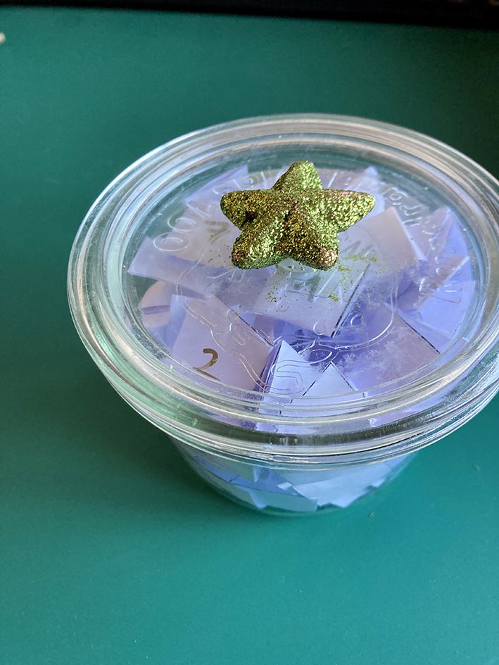 Auf dem Bild sind mehr als 24 Zettel im Glas – ich habe alle Zettelchen ausgeschnitten und in das Glas getan – so habe ich die Auswahl (siehe beim Tipp).
