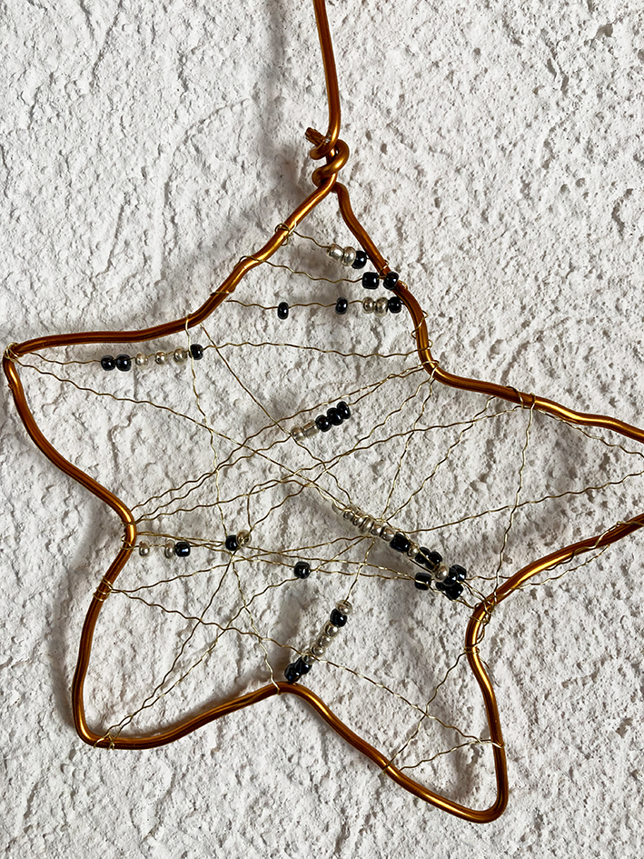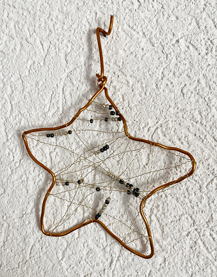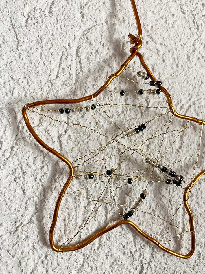 Den Aludraht in eine schöne Sternenform bringen. (Das hat bei mir am Längsten gedauert…) Perlen nach Belieben auf den filigranen Draht fädeln und wie es dir gefällt um das «Grundgerüst» wickeln, bis euch der Stern gefällt!