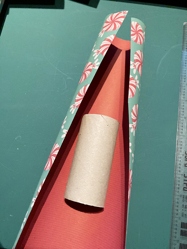 Vom Geschenkpapier ca. 15 cm breite Streifen schneiden und diese dann in der Länge halbieren