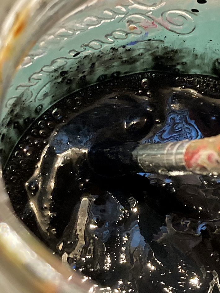 Das Gemisch trägst du nun grosszügig auf die abgeklebte Stelle die zum aufrubbeln gedacht ist und lässt es gut trocknen. Falls du das Geschriebene oder gemalte noch lesen kannst, lässt du es trocknen und trägst dann die Farbe nochmals auf.