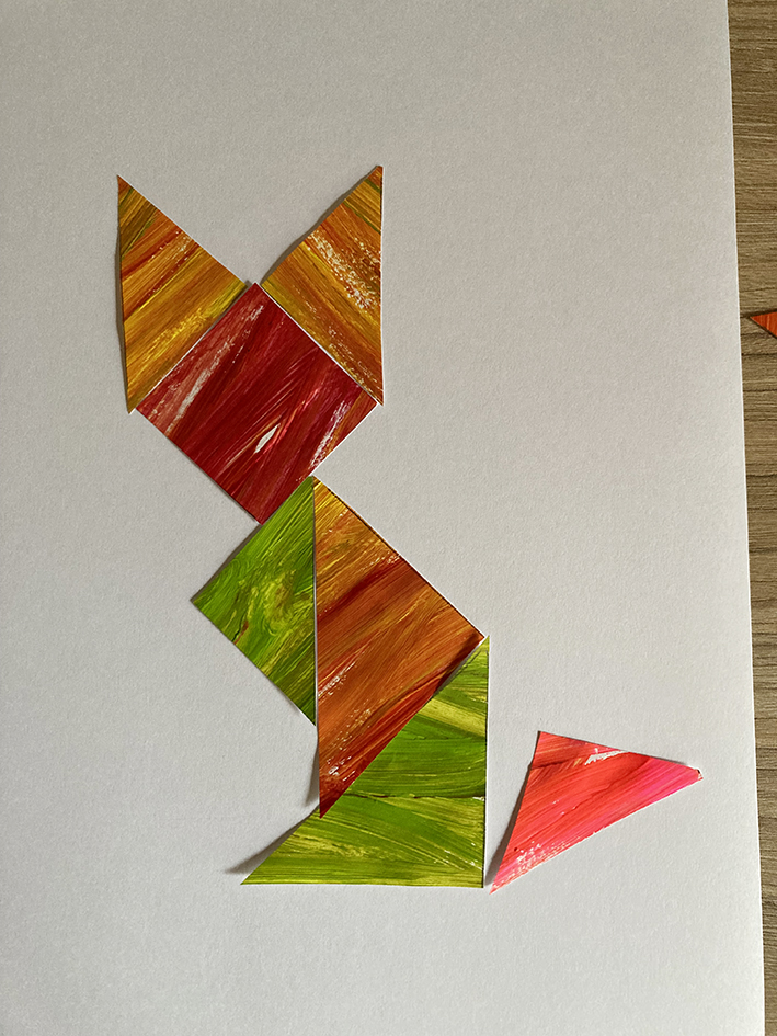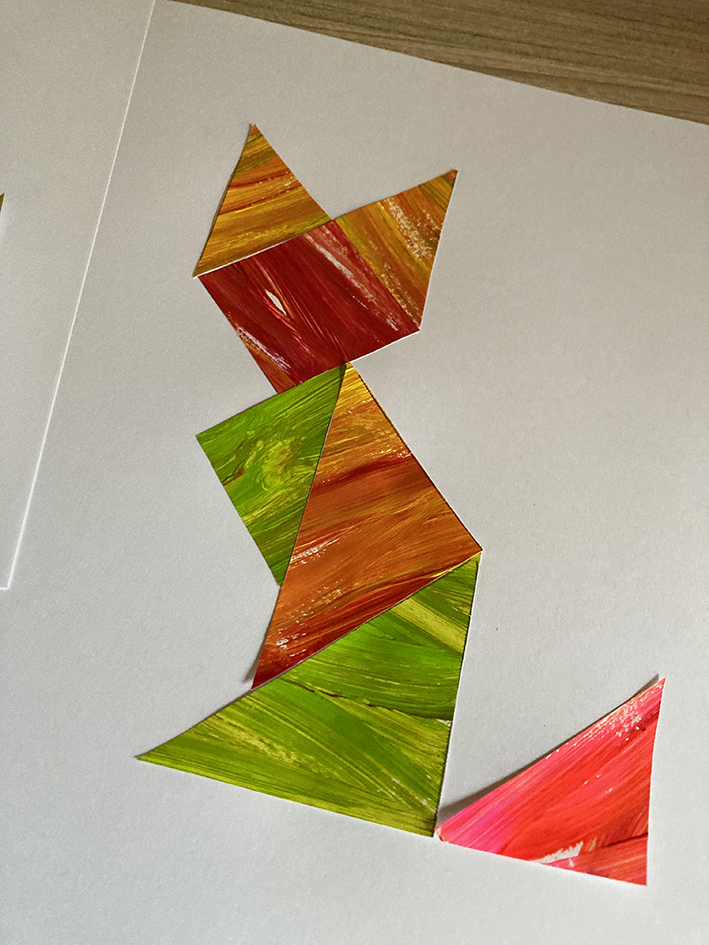 Tangram ist ein altes chinesisches Legespiel. Ich kenne es noch aus meiner Kindheit wo wir dieses Spiel hatten und jeweils mit den verschieden farbigen Dreiecken und Rauten ein Muster nachlegen mussten.