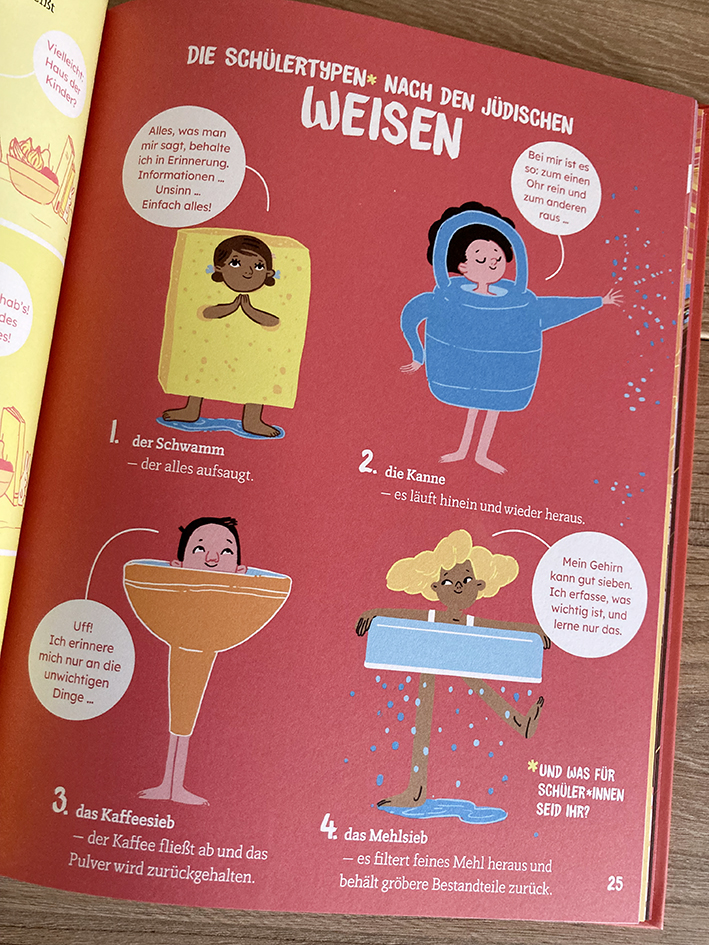 Weiter gibt es lustiges, wie zum Beispiel welcher Schülertyp ihr seid… der Schwamm, die Kanne oder das Sieb? Du findest auch Antworten auf wichtige Fragen wie: »Wer hat das Sandwich erfunden?« und »Welche Ausreden hatten die Kinder früher?«, »Warum ärgern sich Lehrer?« und »Warum lohnt es sich, in die Schule zu gehen (auch wenn es dort manchmal langweilig ist)?«