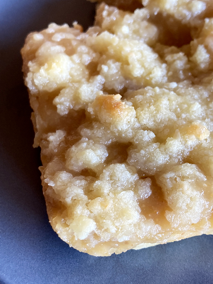 Den Mürbteig rechteckig auswallen und in die Form drücken. Das Apfelmus gleichmässig auf den Mürbteig streichen. Die Streusel über das Apfelmus streuen.