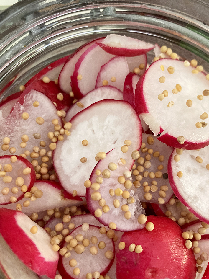Das Wasser mit dem Essig, Zucker, Salz und den Senfkörner aufkochen und in die Gläser, über die Radieschen füllen, bis alle bedeckt sind.
