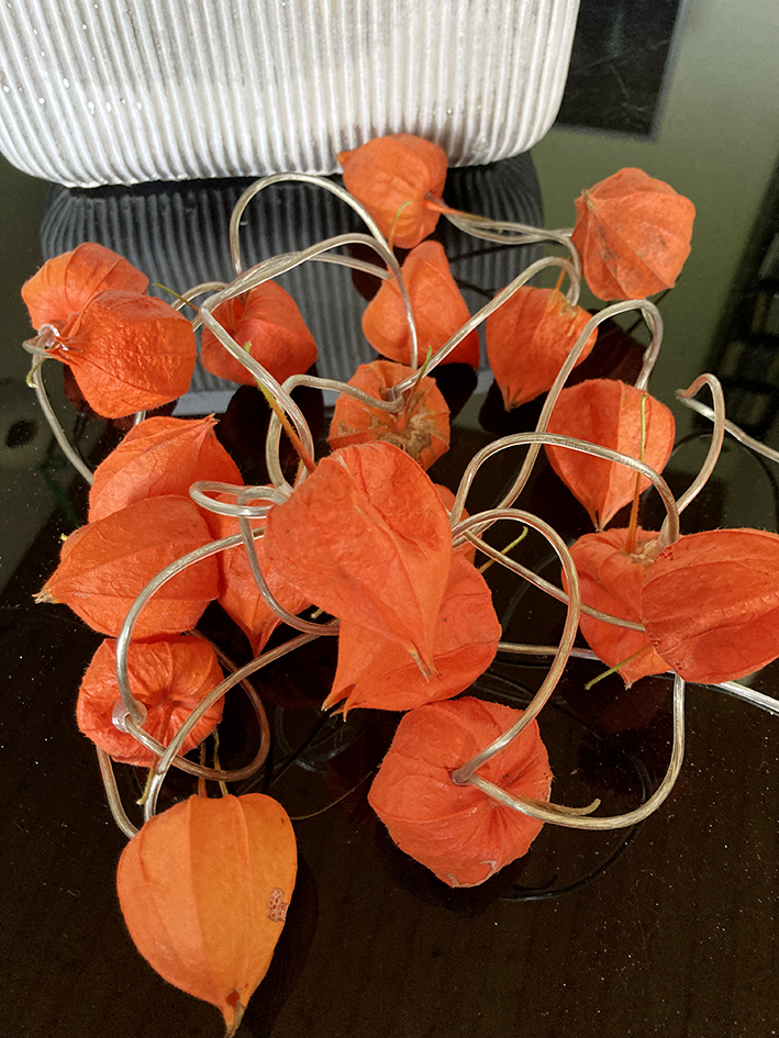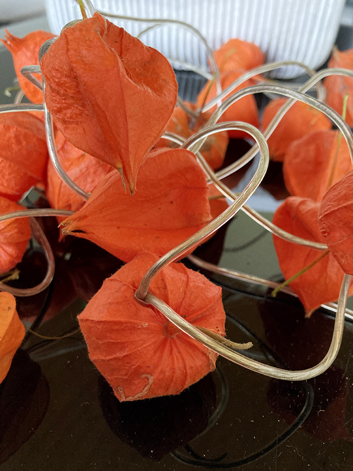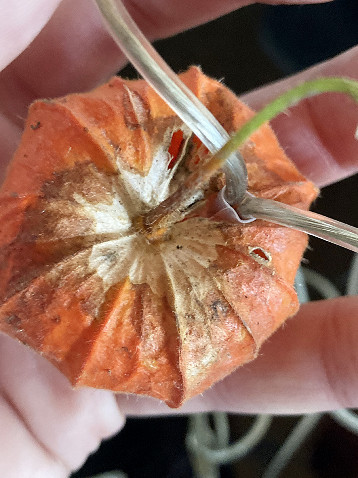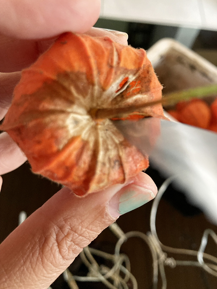 Die organgenen Lampion von der Blume abnehmen. Mit einem spitzigen Messer ein kleines Loch einritzen. Dies geht einfacher, wenn die Lampions frisch von der Pflanze gepflückt sind, danach sind sie brüchiger und man muss einiges vorsichtiger sein…