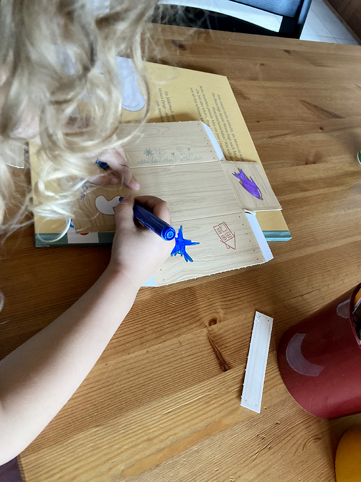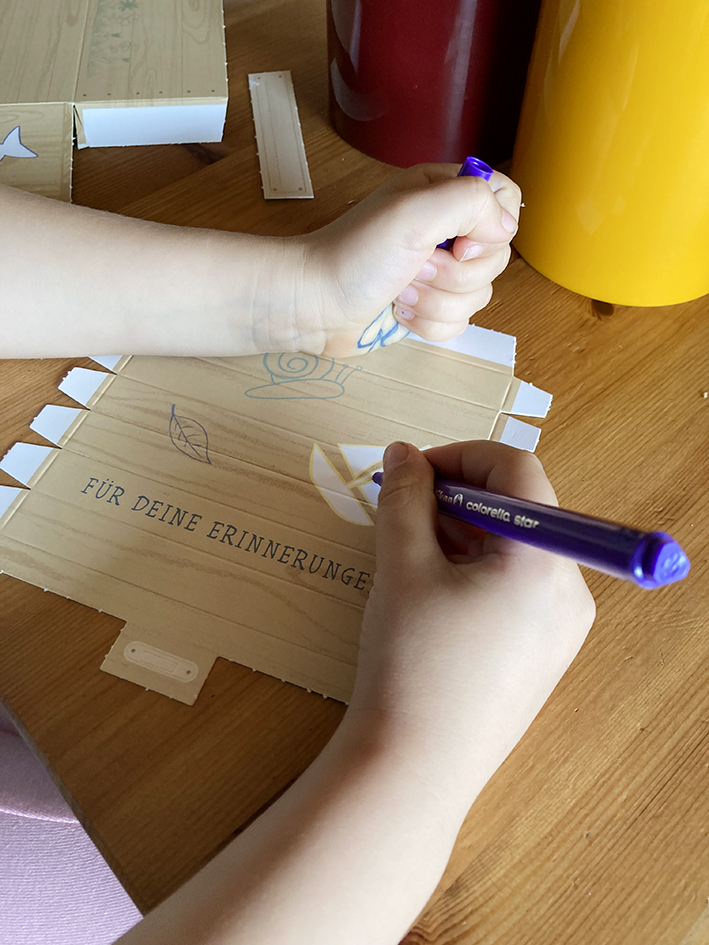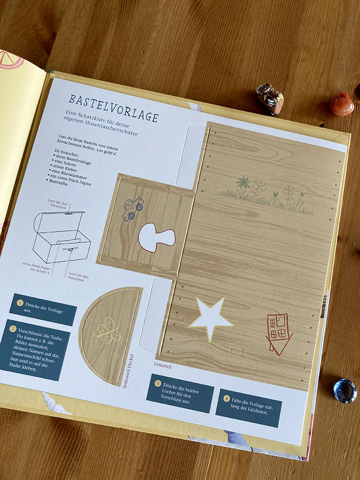 Auf der hintersten Seite enthält das Buch zudem einen Bastelbogen für eine kleine Schatztruhe zum Sammeln der eigenen Hosentaschenschätze.
