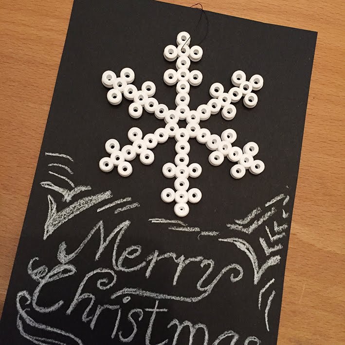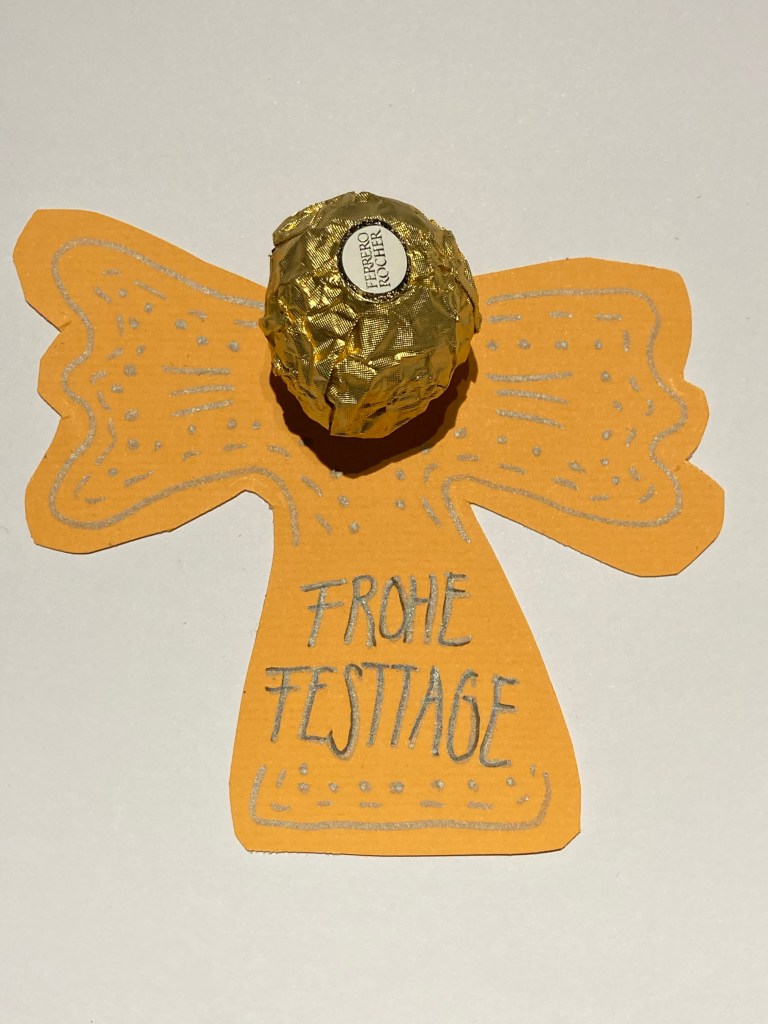 Aus Tonkarton einen Engelumriss zeichnen und ausscheiden. Die Rocherkugel mit Klebeband aufkleben und mit einem Stift etwas verzieren und eine nette Botschaft hinzu schreiben. Fertig ist der süsse Weihnachtsgruss.